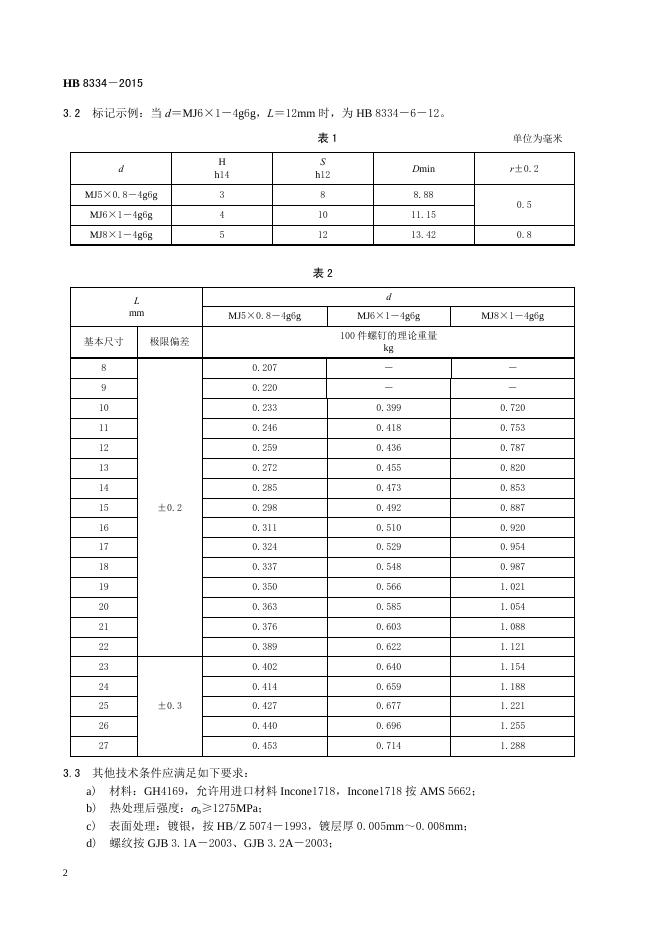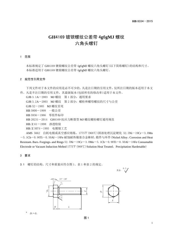 HB 8334-2015(2017) GH4169镀银螺纹公差带4G6GMJ螺纹六角头螺钉