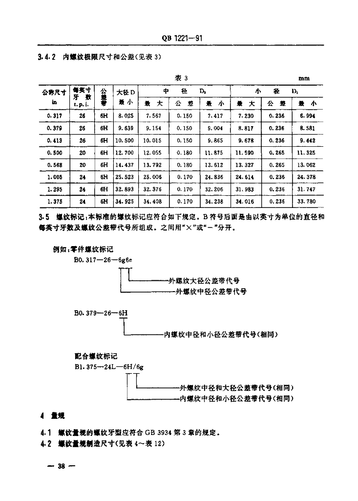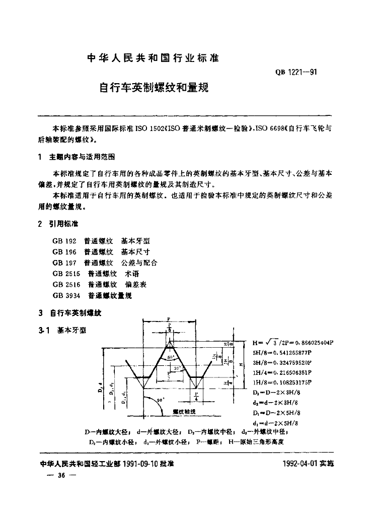 QB/T 1221-1991 自行车英制螺纹和量观(自行车工业标准系列)