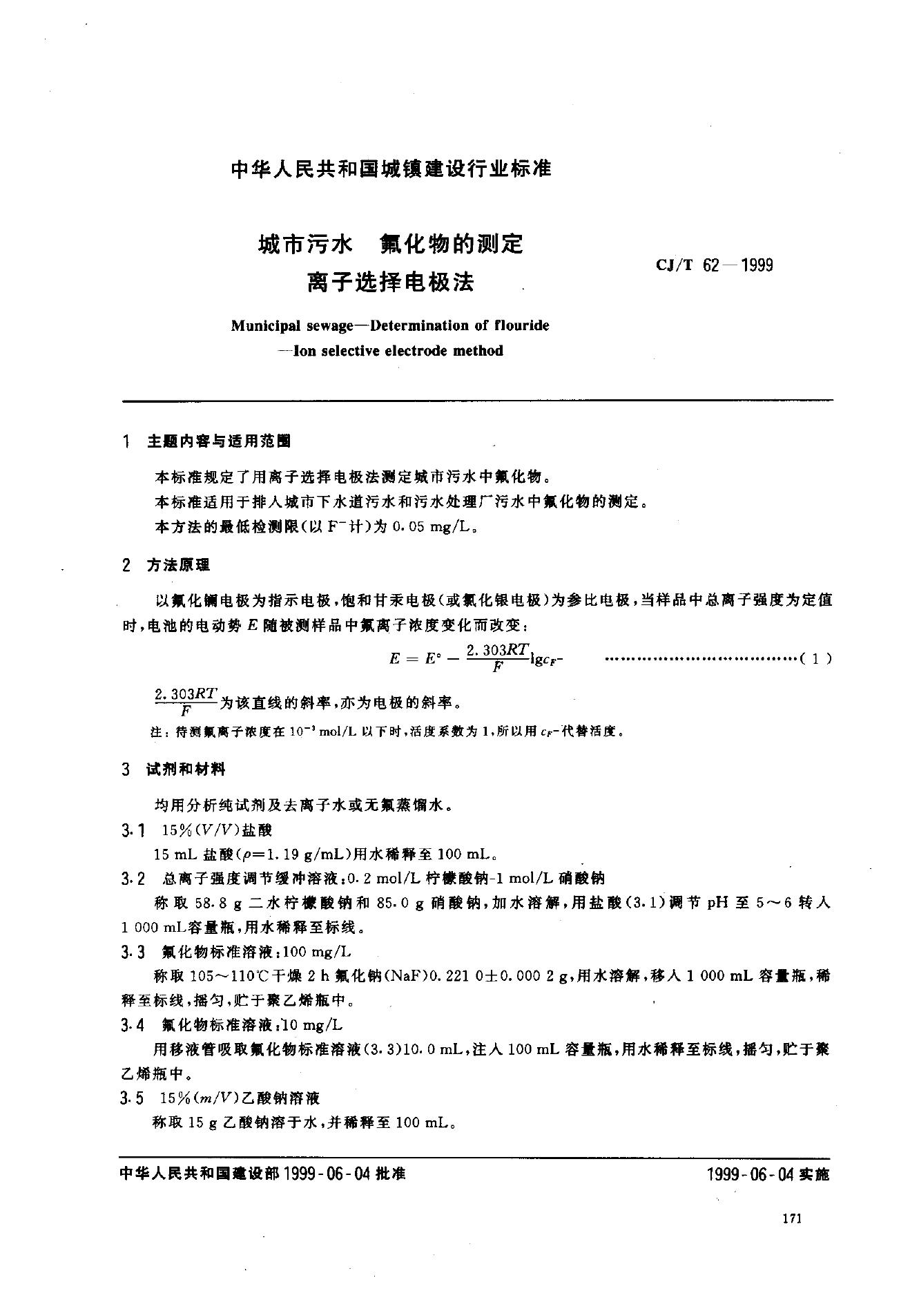 CJ/T 62-1999 城市污水 氟化物的测定 离子选择电极法