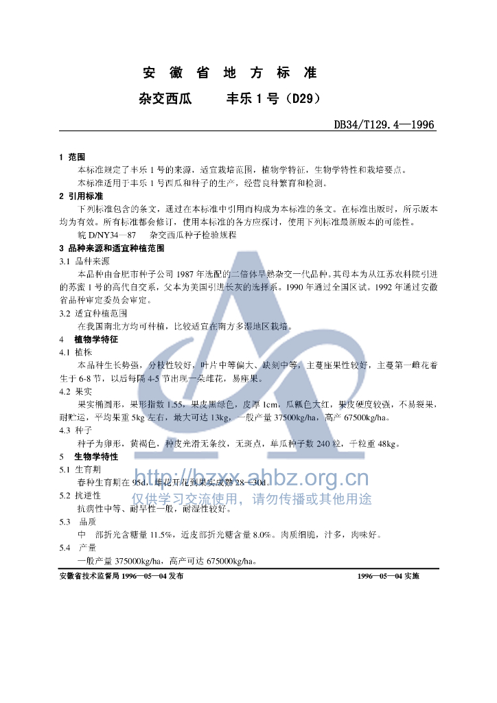 DB34/T 129.4-1996 杂交西瓜 丰乐1号