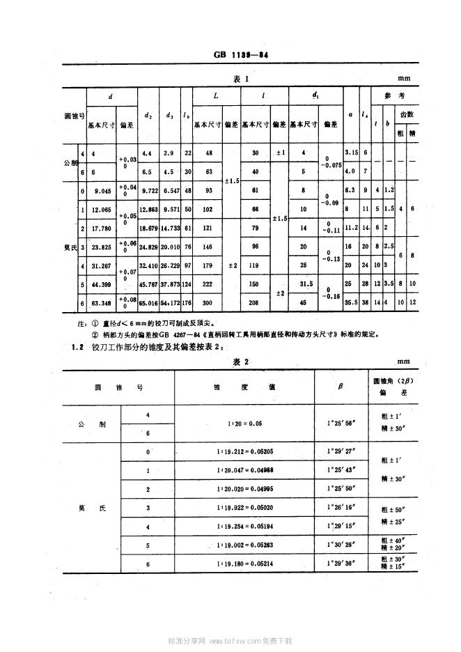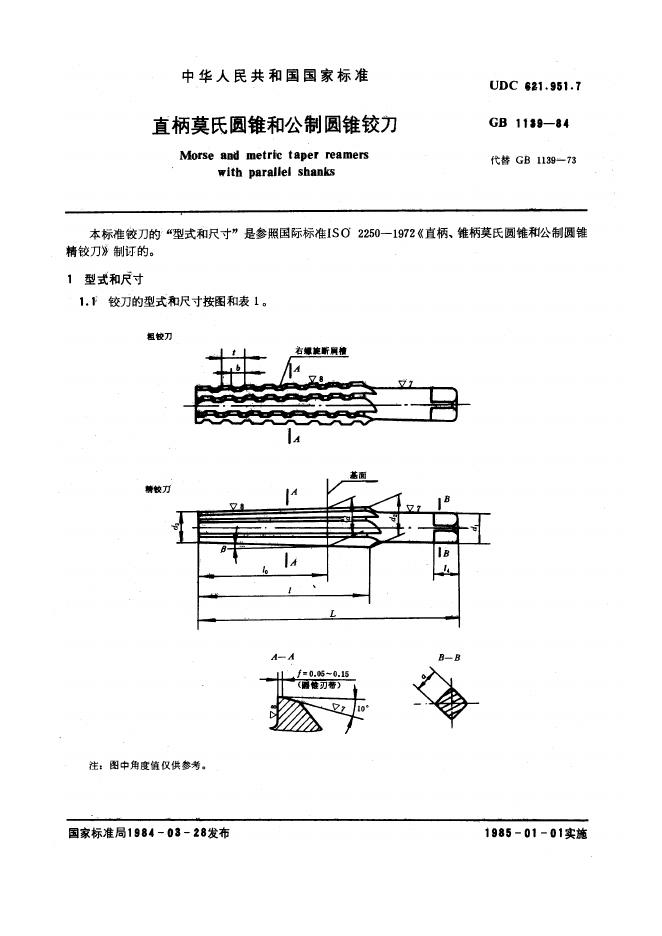 GB/T 1139-1984 直柄莫氏圆锥和公制圆锥铰刀