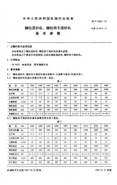 JB/T 2656-1991 辗轮混砂机 辗轮转子混砂机 基本参数