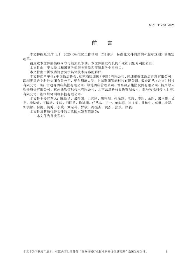 中国饭店协会、如家酒店连锁(中国)有限公司、深圳市锦江酒店管理有限公司、深圳雅里数字科技集团有限公司、华东师范大学、上海擎朗智能科技有限公司、数食汇丛(北京)科技有限公司、浙江雷迪森酒店集团有限公司、绿地酒店管理公司、君亭酒店集团股份有限公司、杭州绿云软件股份有限公司、杭州西软信息技术有限公司、北京云迹科技股份有限公司、鹿马智能科技(上海)有限公司、浙江辉驿网络科技有限公司。