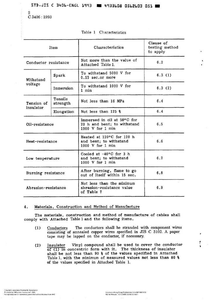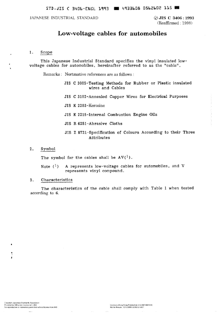 JIS C3406:1993 汽车用低压电缆