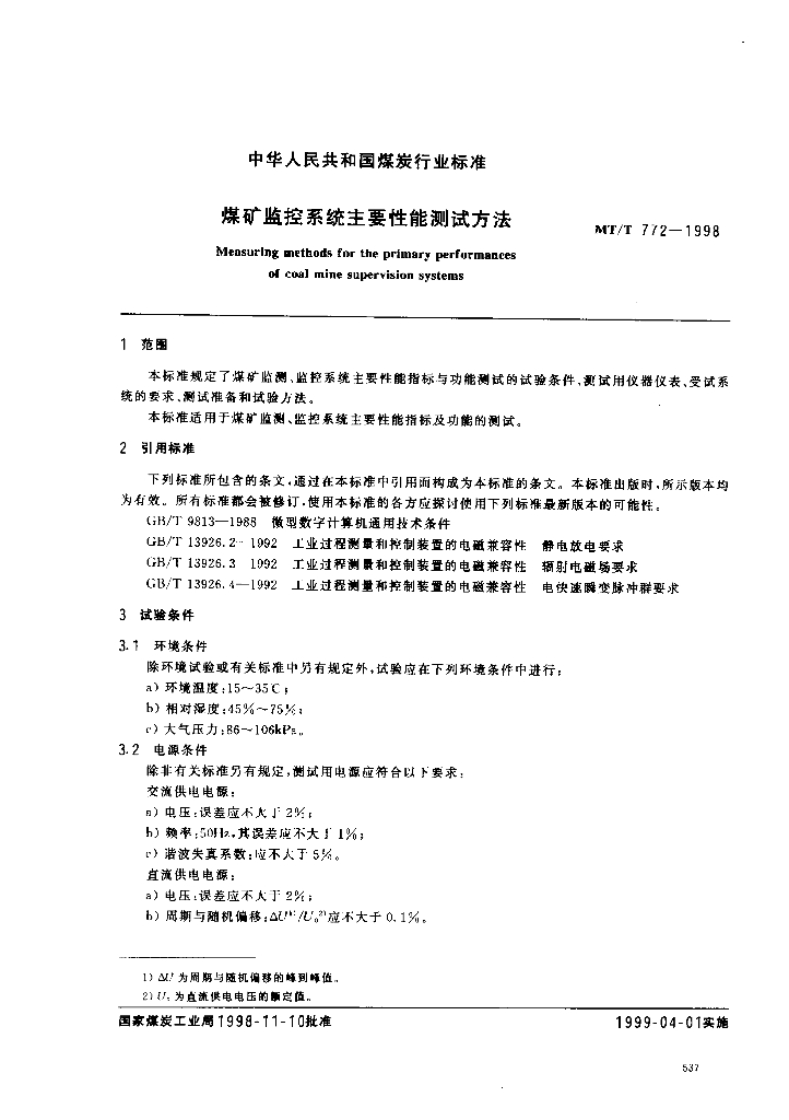 MT/T 772-1998 煤矿监控系统主要性能测试方法