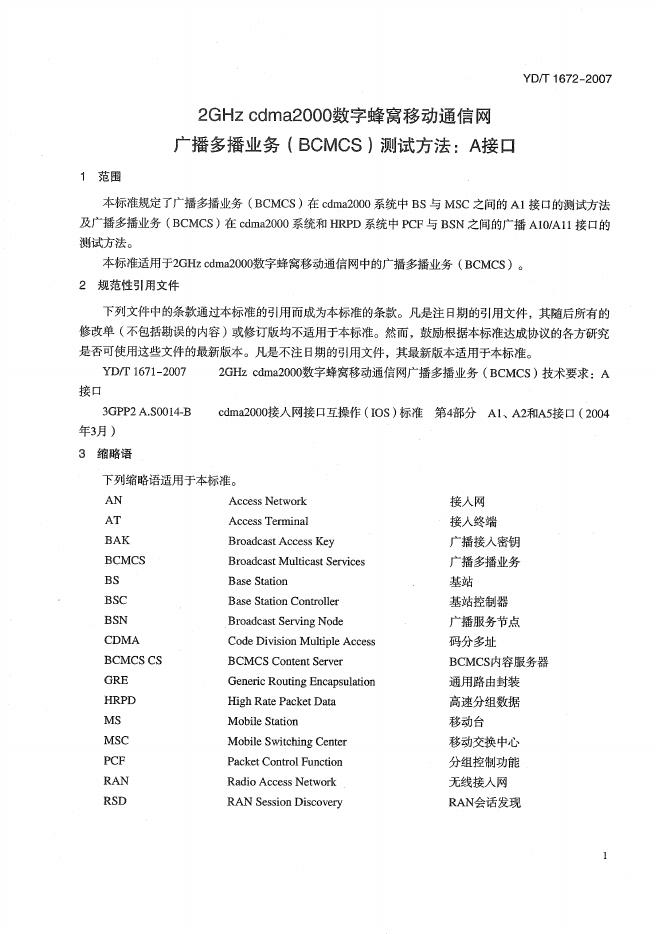 YD/T 1672-2007 2GHz cdma2000数字蜂窝移动通信网广播多播业务(BCMCS)测试方法:A接口