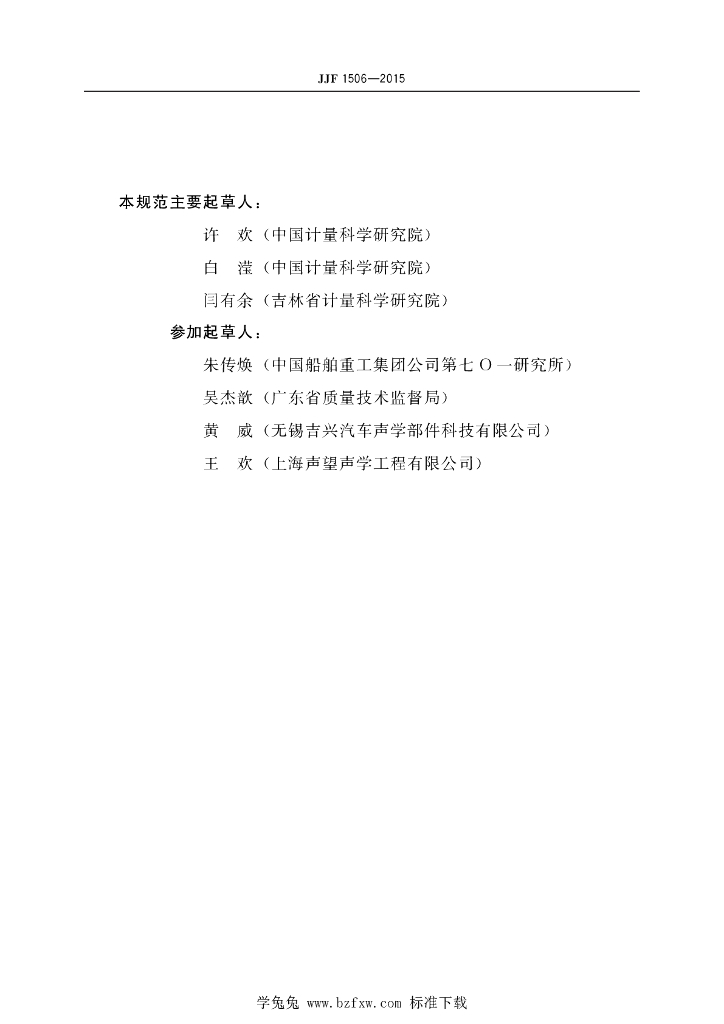 许欢(中国计量科学研究院)、白滢(中国计量科学研究院)、闻有余(吉林省计量科学研究院)、朱传焕(中国船舶重工集团公司第七O一研究所)、吴杰欲(广东省质量技术监督局)、黄威(无锡吉兴汽车声学部件科技有限公司)、王欢(上海声望声学工程有限公司)