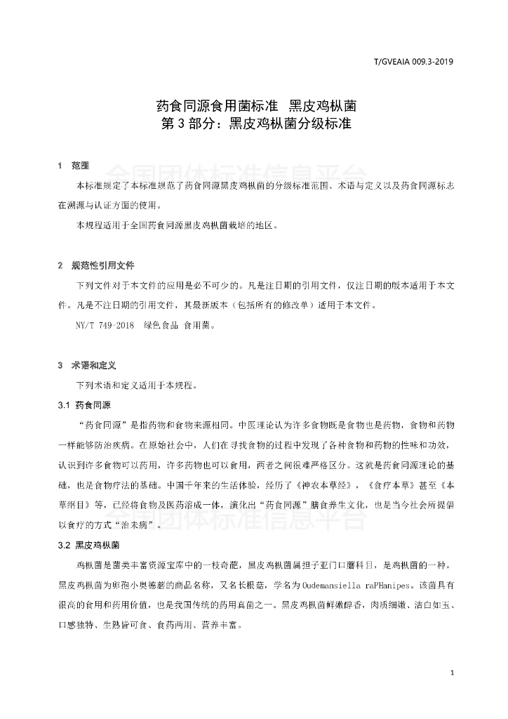 T/GVEAIA 009.3-2019 药食同源食用菌标准 黑皮鸡枞菌 第3部分:黑皮鸡枞菌分级标准