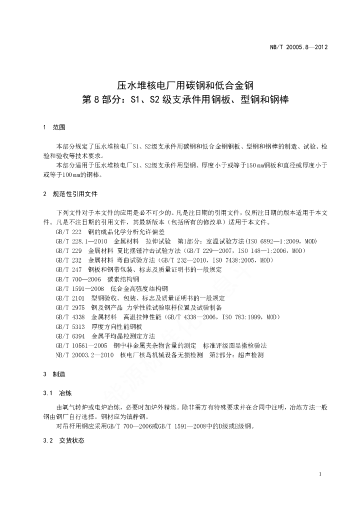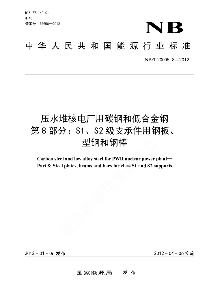 NB/T 20005.8-2012 压水堆核电厂用碳钢和低合金钢 第8部分:S1、S2级支承件用钢板、型钢和钢棒
