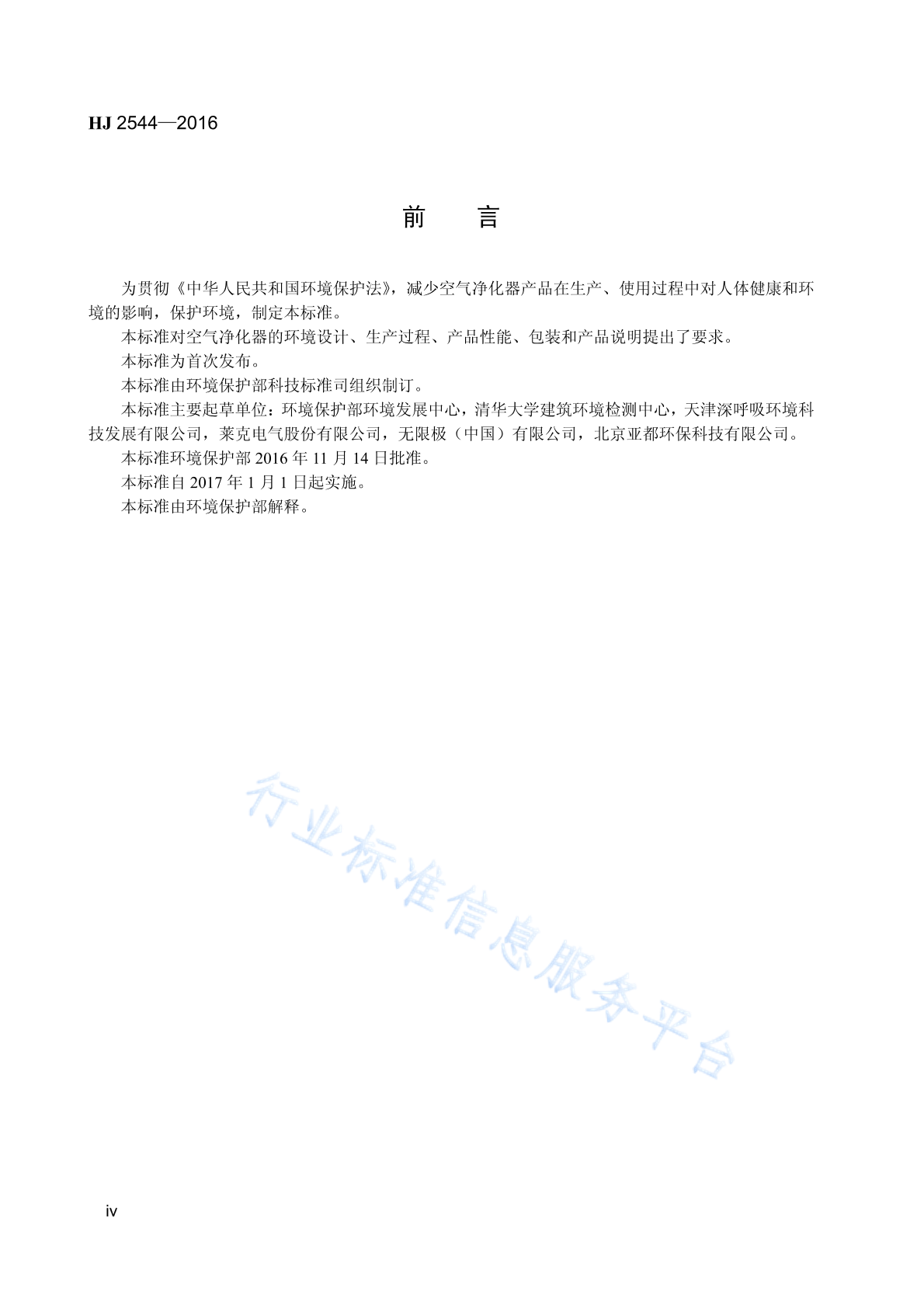 HJ 2544-2016 环境标志产品技术要求 空气净化器