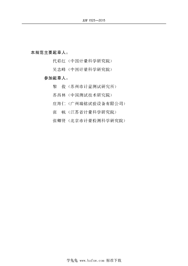 代彩红(中国计量科学研究院)、吴志峰(中国计量科学研究院)、黎俊(苏州市计量测试研究所)、苏昌林(中国测试技术研究院)、庄海仁(广州瑞铭试验设备有限公司)、张帆(江苏省计量科学研究院)、张卿贤(北京市计量检测科学研究院)