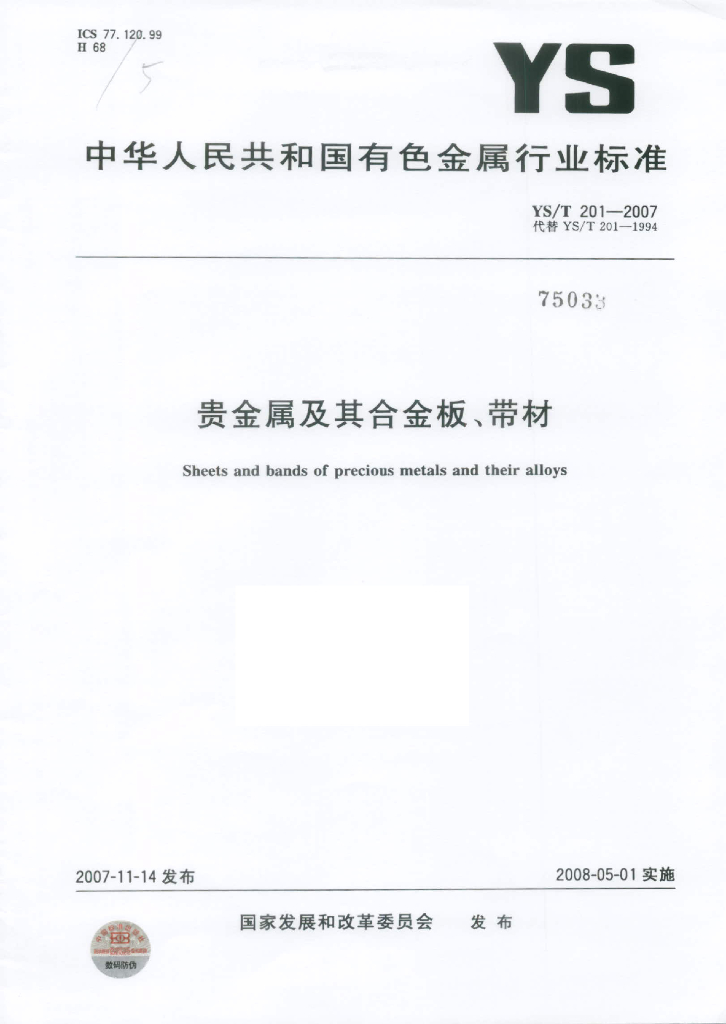 YS/T 201-2007 贵金属及其合金板、带材