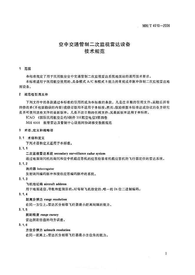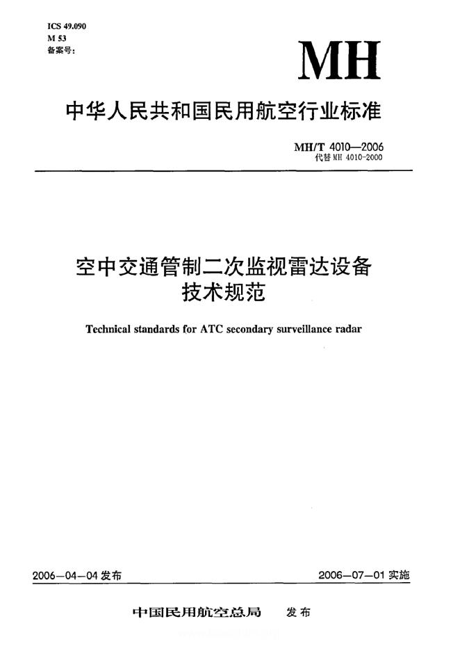 MH/T 4010-2006 空中交通管制二次监视雷达设备技术规范