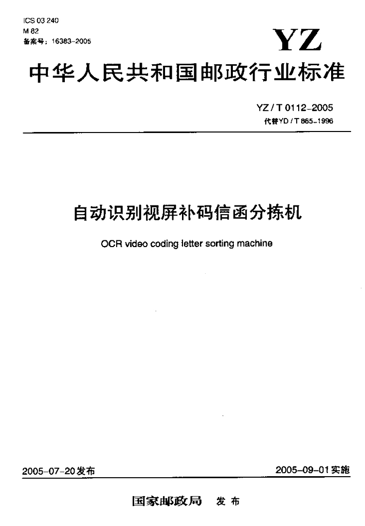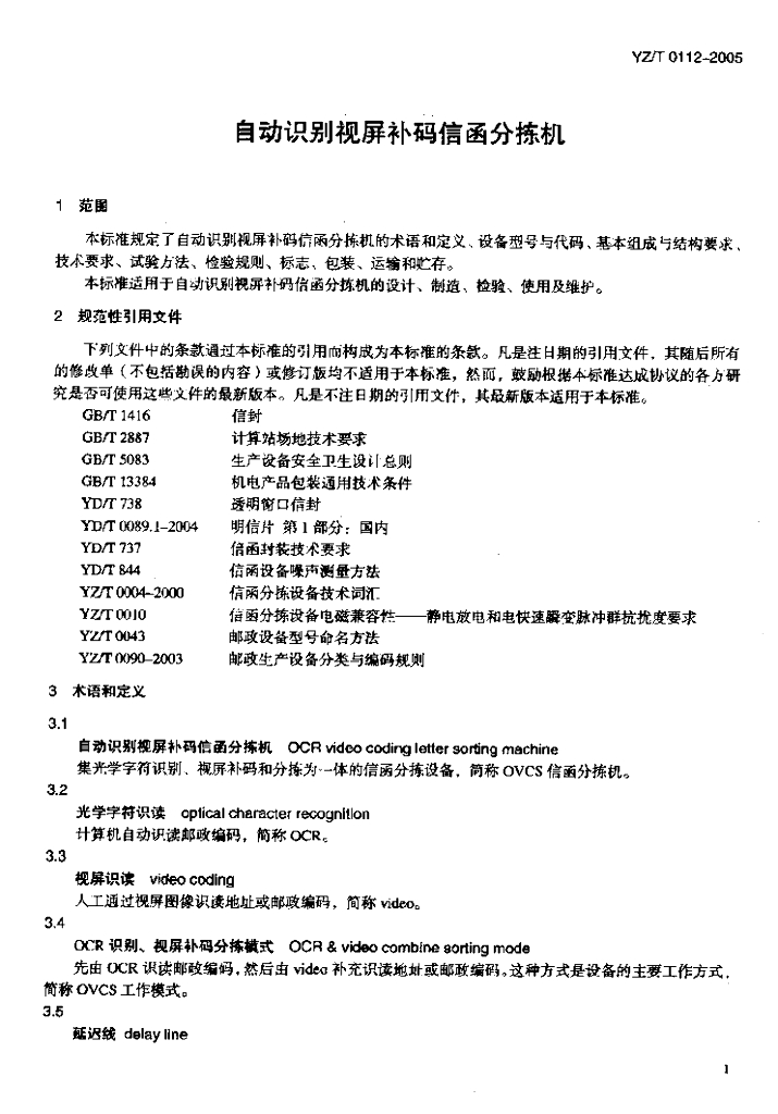 YZ/T 0112-2005 自动识别视屏补码信函分拣机