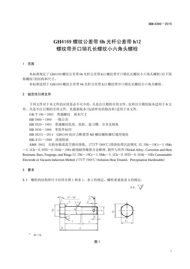 HB 8360-2015 GH4169螺纹公差带6H光杆公差带H12螺纹带开口销孔长螺纹小六角头螺栓(2017)