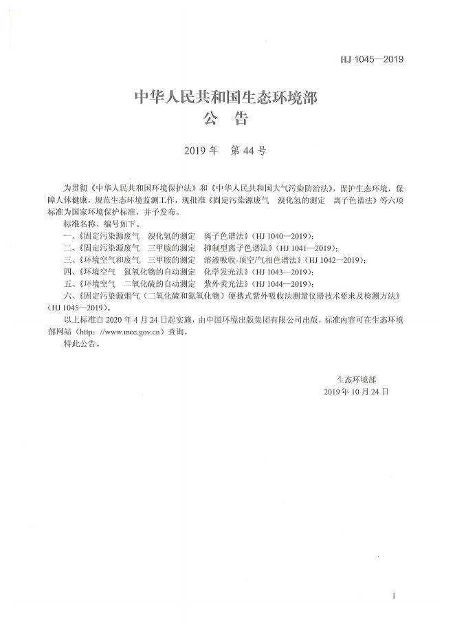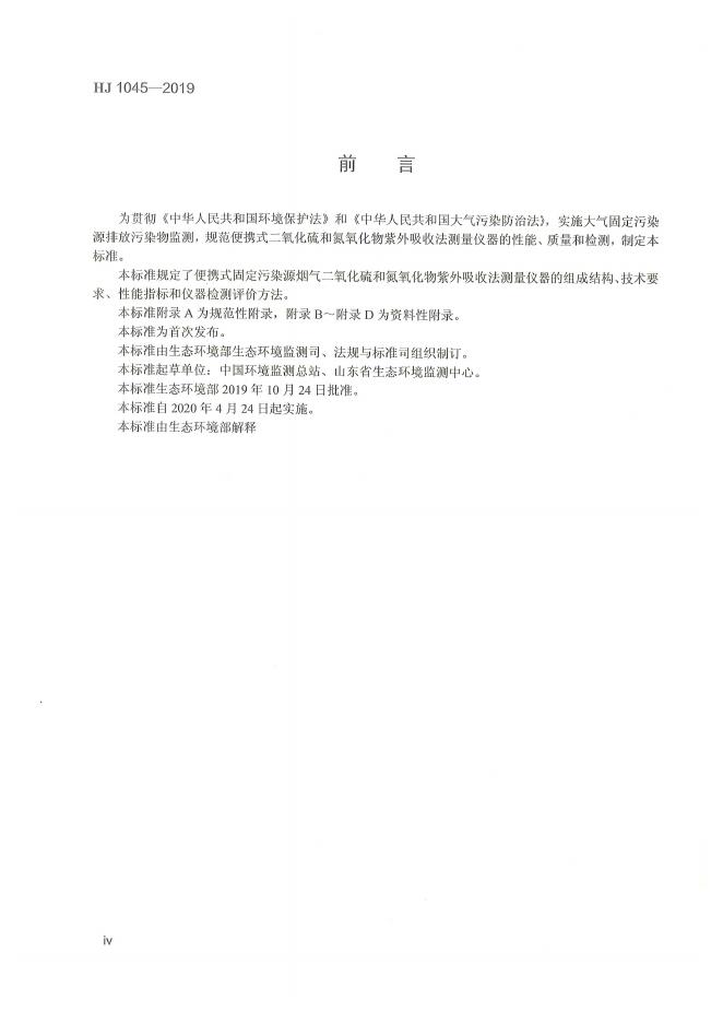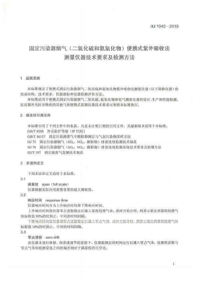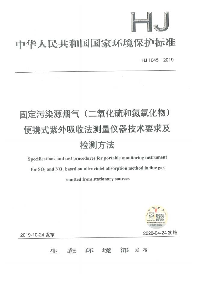 HJ 1045-2019 固定污染源烟气(二氧化硫和氮氧化物)便携式紫外吸收法测量仪器技术要求及检测方法