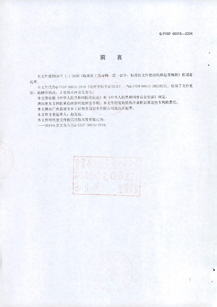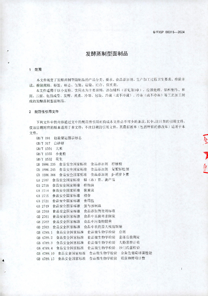Q/FXSP 0001S-2024 发酵蒸制型面制品