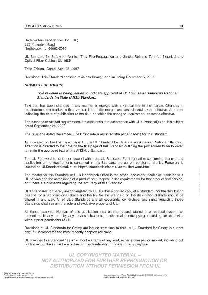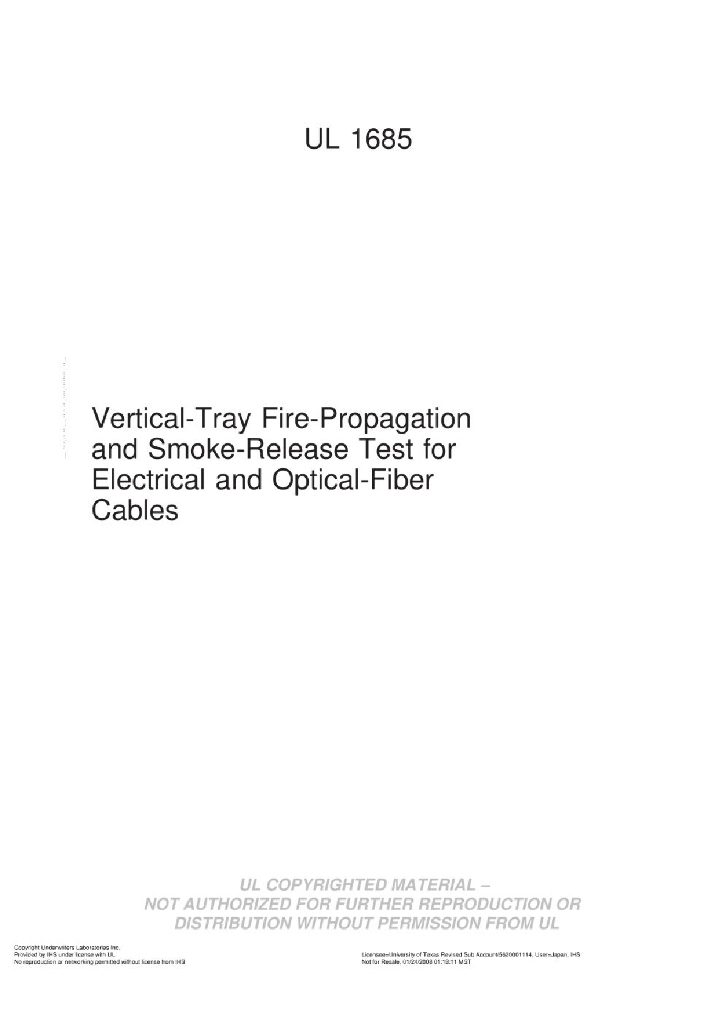 UL 1685-2007 垂直电缆槽-电缆及光纤电缆火焰蔓延及烟雾释放测试 中英文对译