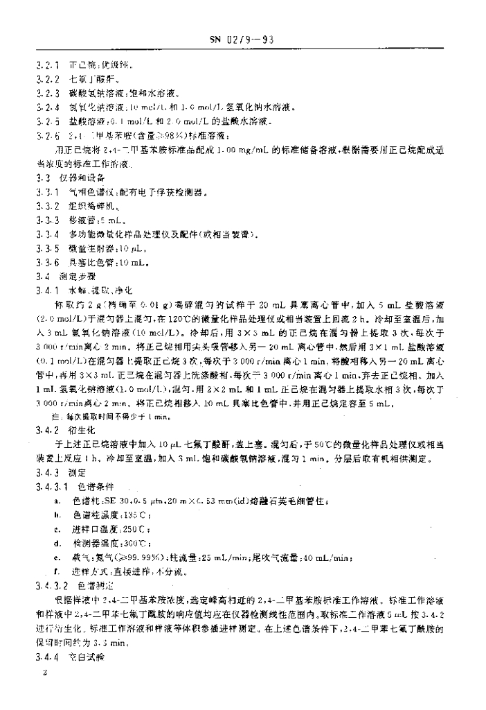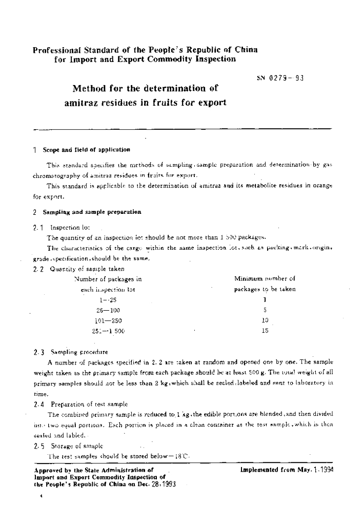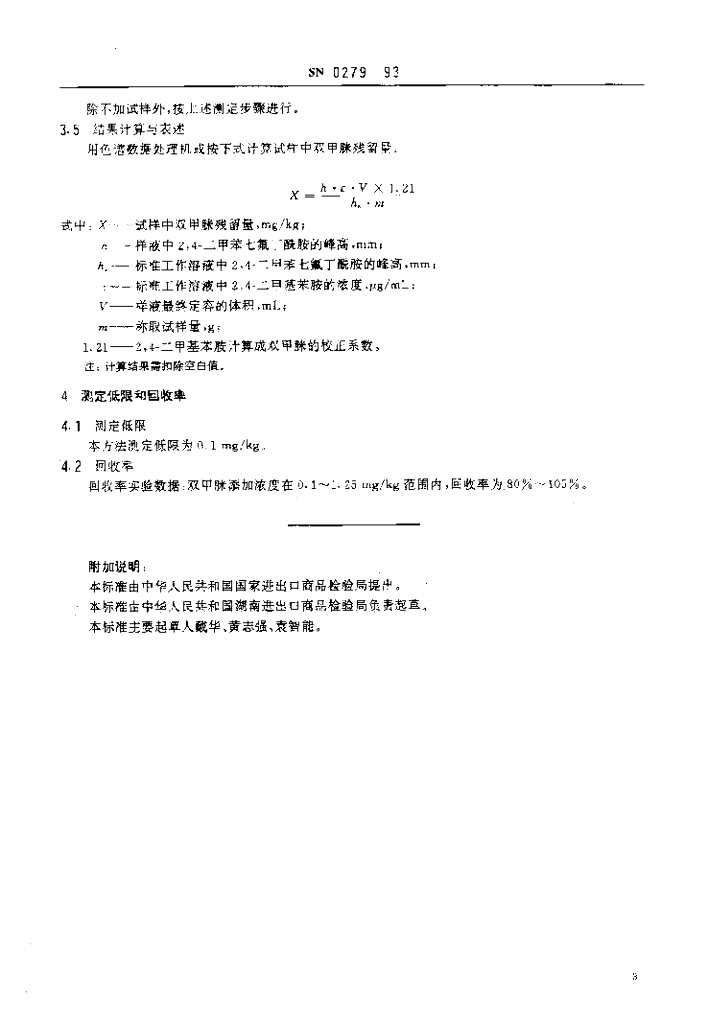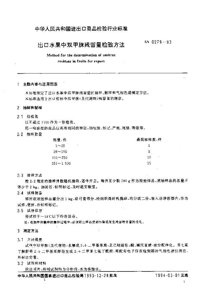 SN 0279-1993 出口水果中双甲脒残留量检验方法