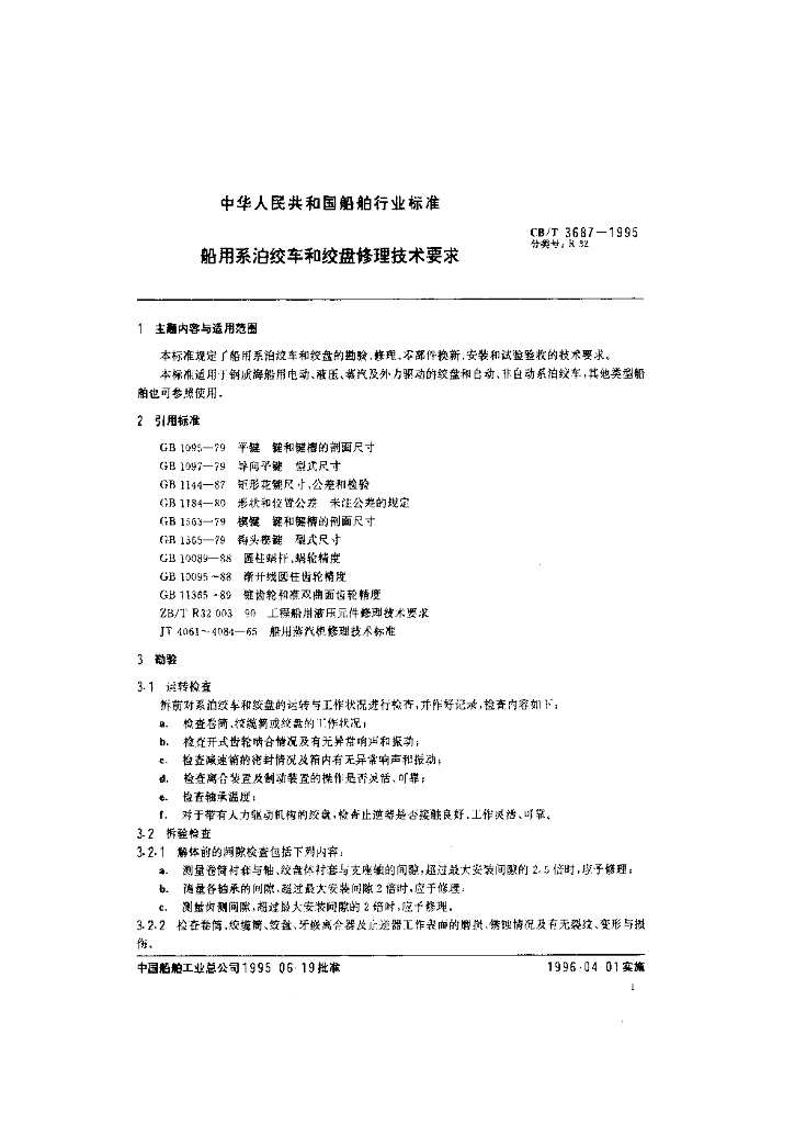CB/T 3687-1995 船用系泊绞车和绞盘修理技术要求