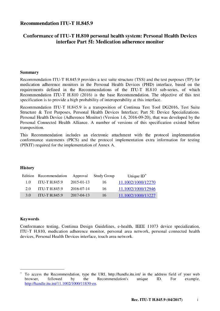 ITU-T H.845.9-2017 ITU-T H.810个人医疗卫生系统一致性 个人卫生设备接口 第5I部分 依从监视器