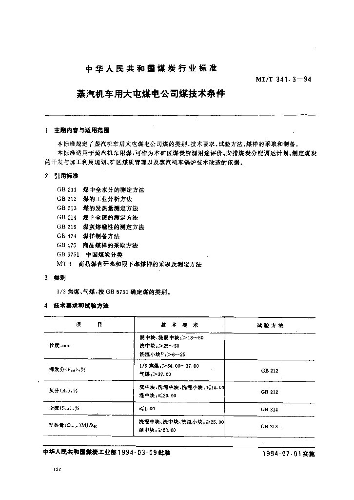 MT/T 341.3-1994 蒸汽机车用大屯煤电公司煤技术条件