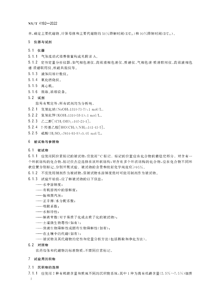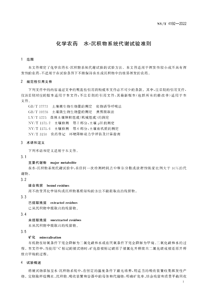 NY/T 4192-2022 化学农药 水-沉积物系统代谢试验准则