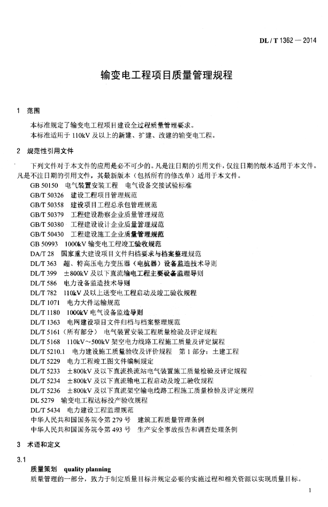 DL/T 1362-2014 输变电工程项目质量管理规程