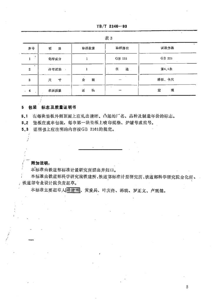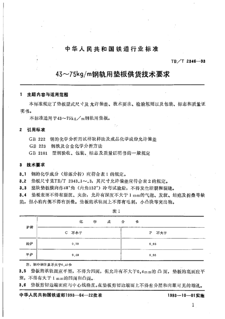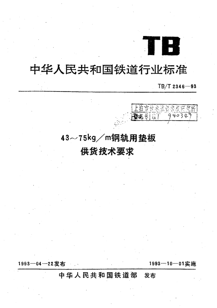 TB/T 2346-1993 43~75kg/m钢轨用垫板供货技术要求