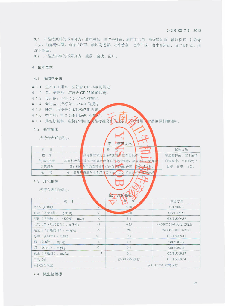 Q/CHG 0017S-2015 楚雄宏桂绿色食品有限公司 油炸食用菌
