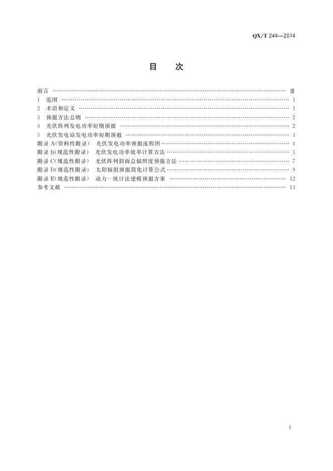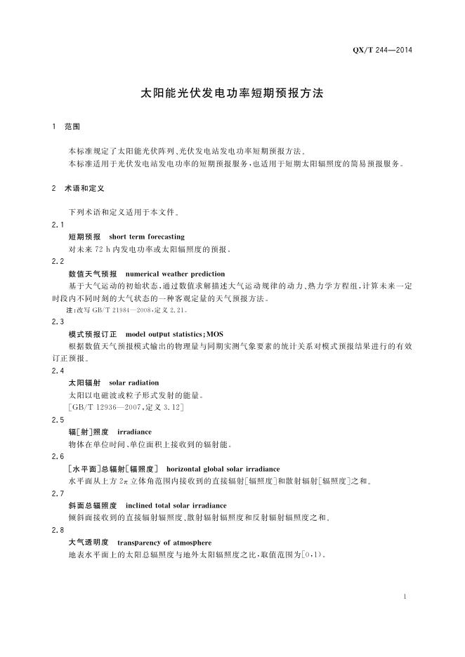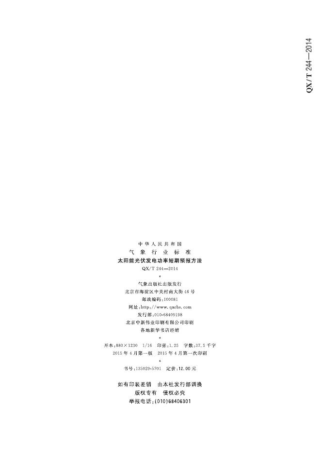 QX/T 244-2014 太阳能光伏发电功率短期预报方法