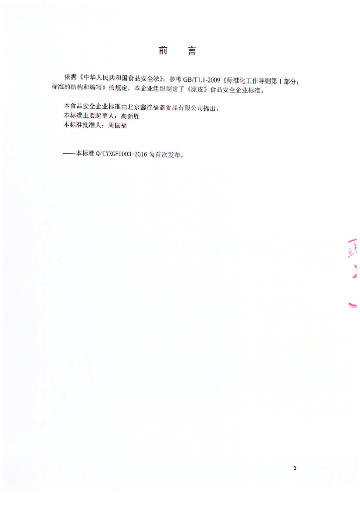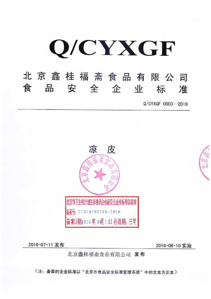 Q/CYXGF 0003-2016 北京鑫桂福斋食品有限公司 凉皮