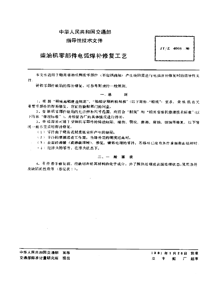 JT/Z 4005-1980 柴油机零部件电弧焊补修复工艺