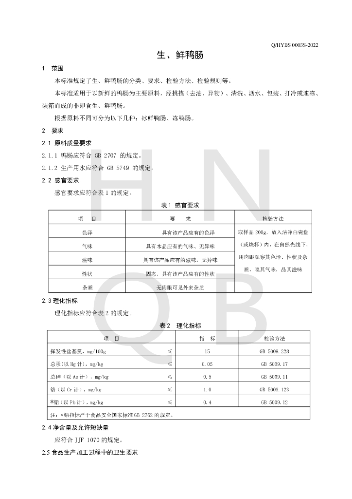 Q/HYBS 0003S-2022 生、鲜鸭肠