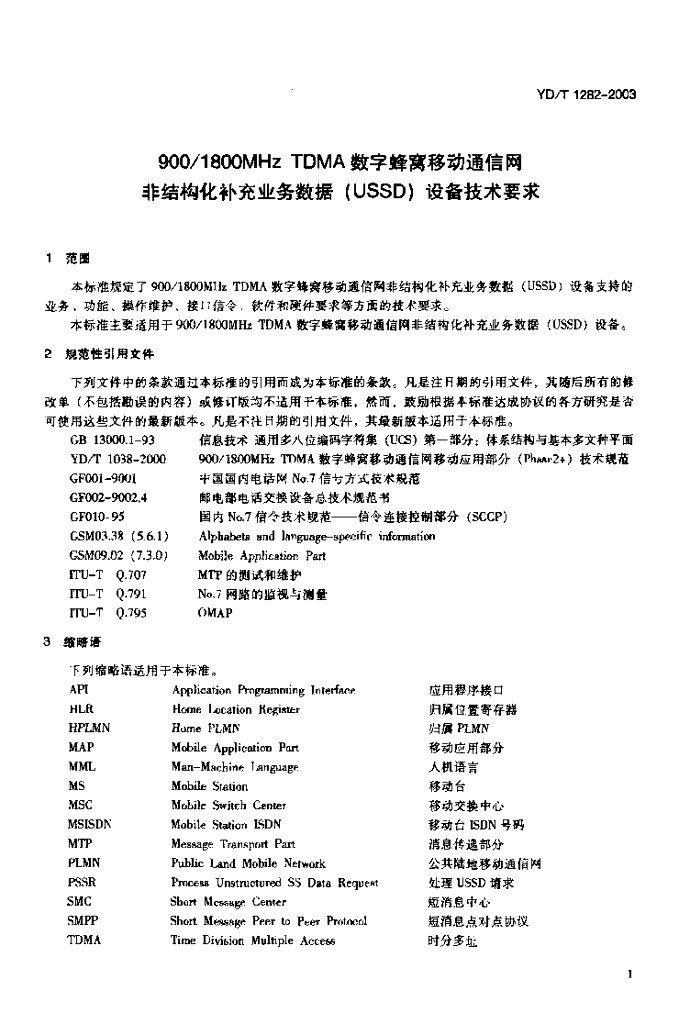 YD/T 1282-2003 900/1800MHz TDMA 数字蜂窝移动通信网非结构化补充业务数据(USSD)设备技术要求