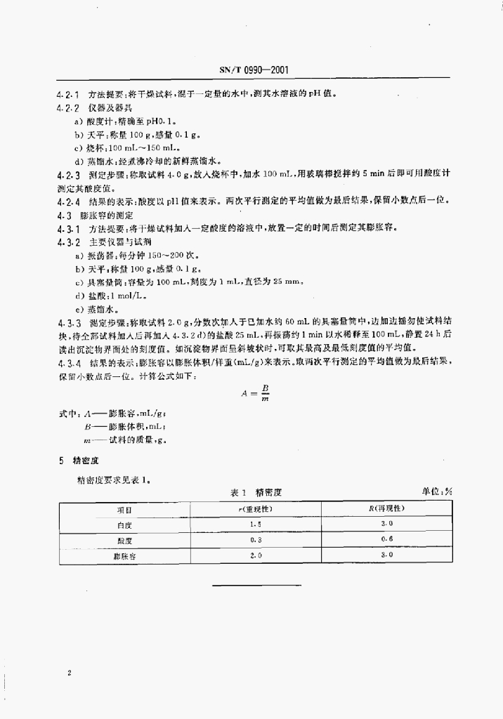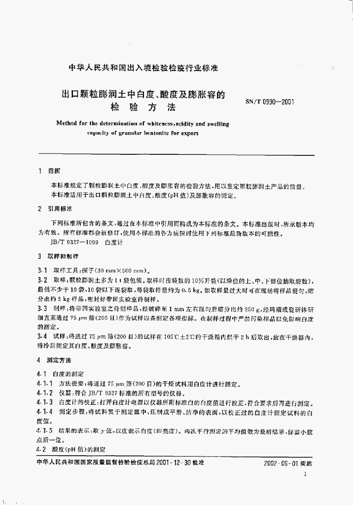 SN/T 0990-2001 出口颗粒膨润土中白度、酸度及膨胀容的检验方法
