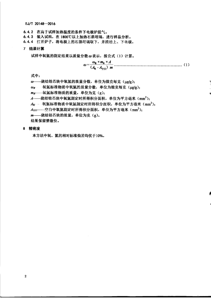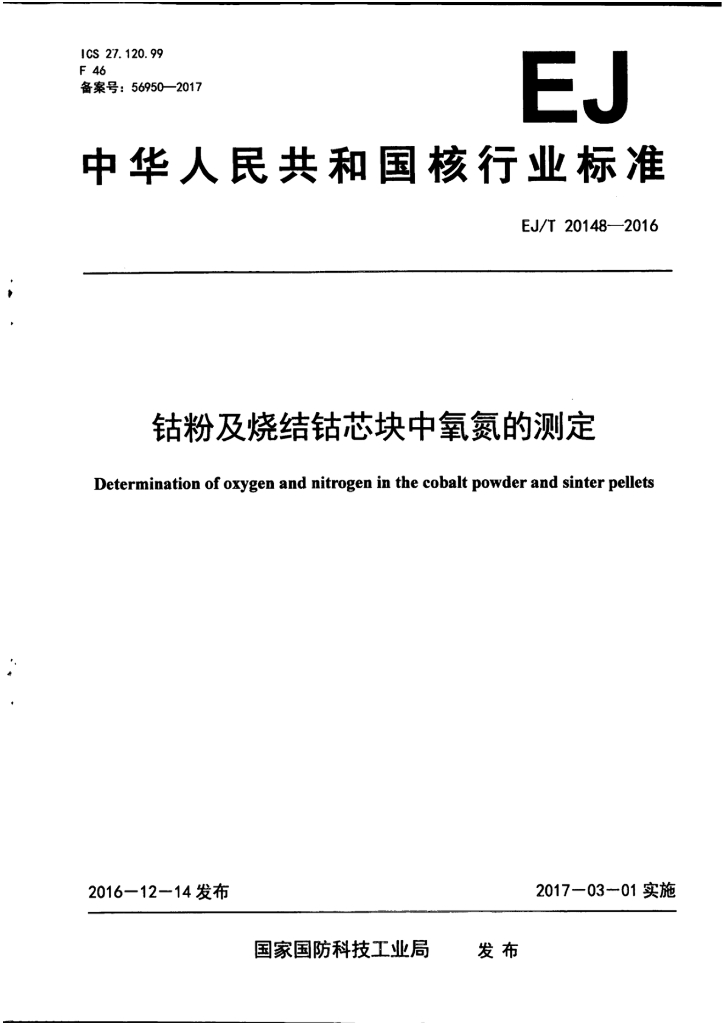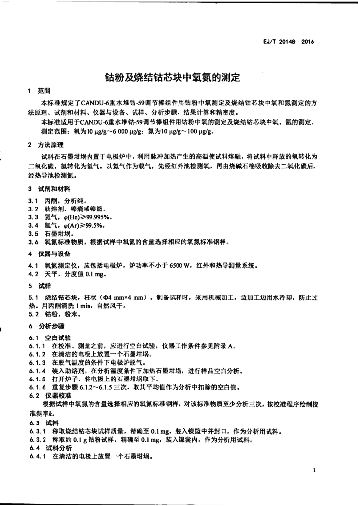 EJ/T 20148-2016 钴粉及烧结钴芯块中氧氮的测定
