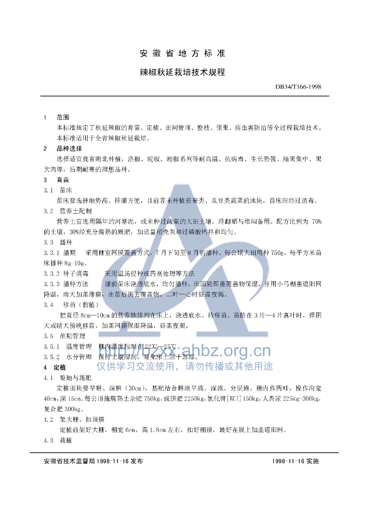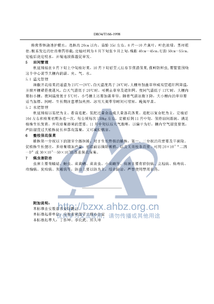 DB34/T 166-1998 辣椒秋延栽培技术规程