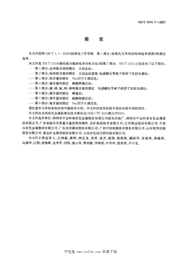 深圳市中金岭南有色金属股份有限公司韶关冶炼厂、深圳市中金岭南有色金属股份有限公司、广东省韶关市质量计量监督检测所、北矿检测技术有限公司、江西铜业股份有限公司、中条山有色金属集团有限公司、广东先导稀材股份有限公司、广西中检检测技术服务有限公司、山东恒邦冶炼股份有限公司、紫金矿业集团股份有限公司、大冶有色设计研究院有限公司