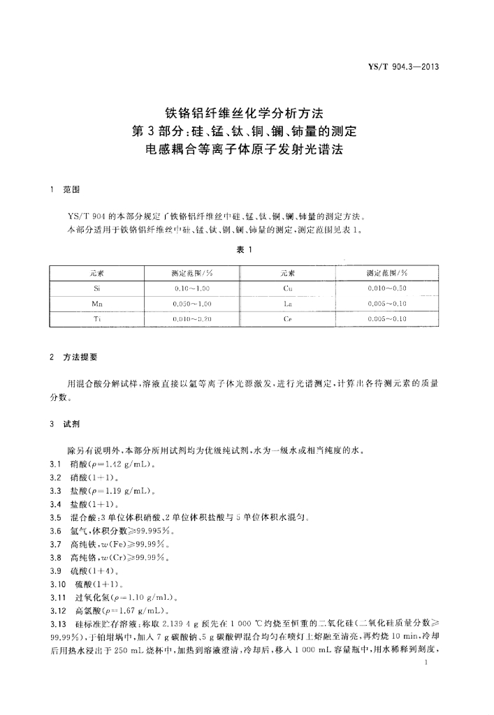 YS/T 904.3-2013 铁铬铝纤维丝化学分析方法 第3部分:硅、锰、钛、铜、镧、铈量的测定电感耦合等离子体原子发射光谱法
