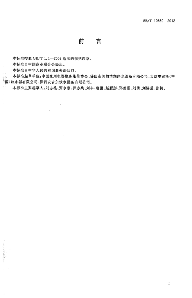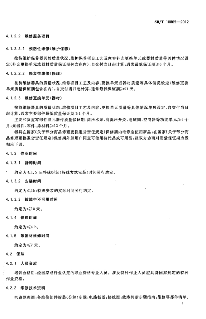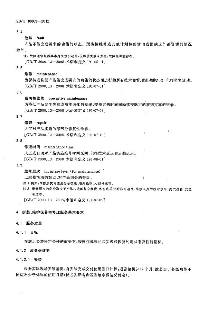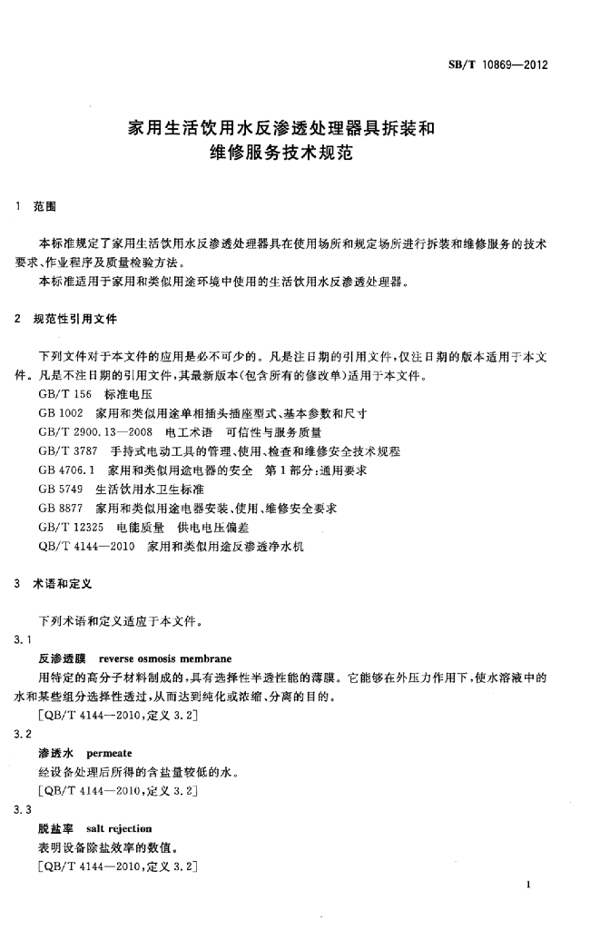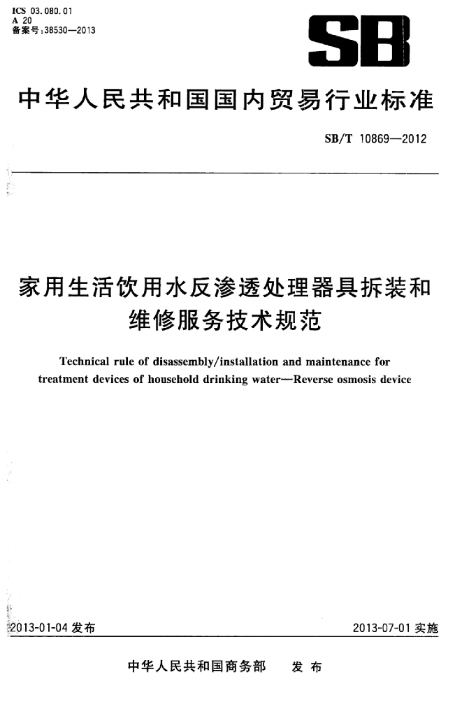 SB/T 10869-2012 家用生活饮用水反渗透处理器拆装和维修服务技术规范