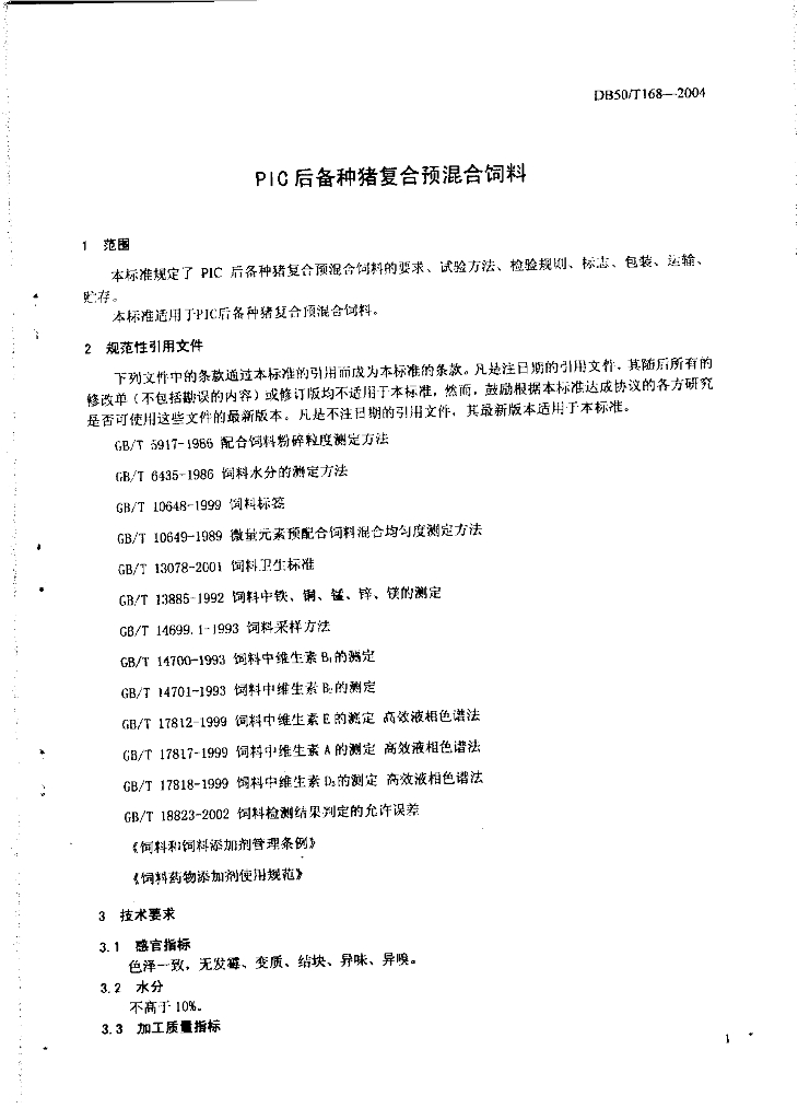 DB50/T 168-2004 PIC后备种猪复合预混合饲料