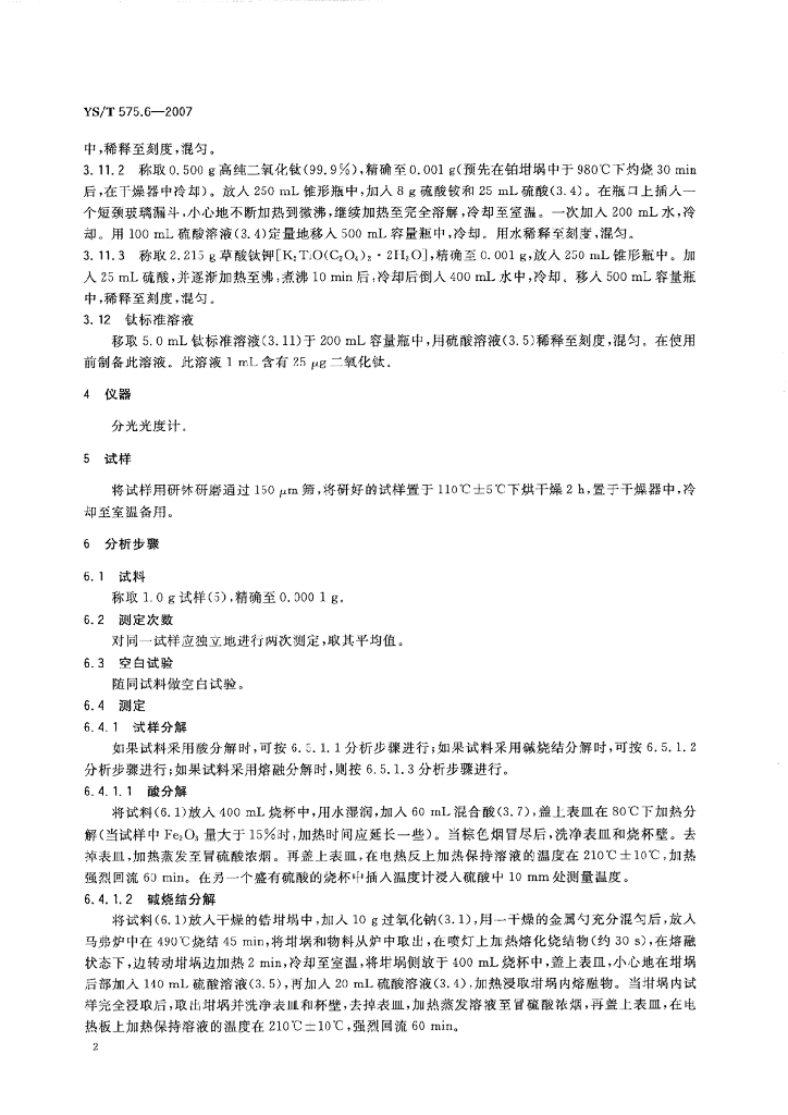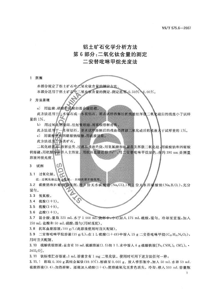 YS/T 575.6-2007 铝土矿石化学分析方法 第6部分:二氧化钛含量的测定 二安替吡啉甲烷光度法
