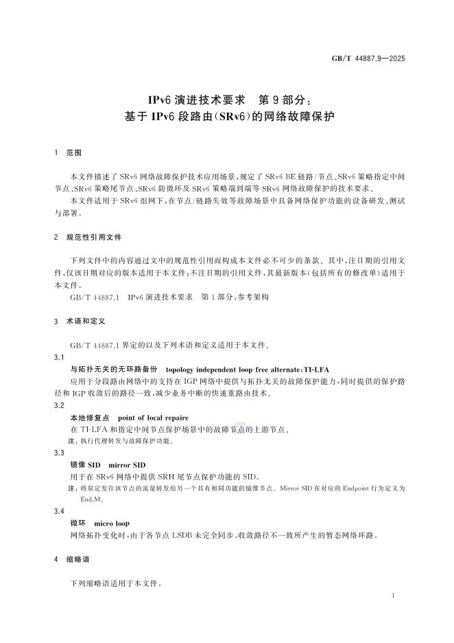 GB/T 44887.9-2025 IPv6 演进技术要求 第9部分:基于IPv6段路由(SRv6)的网络故障保护