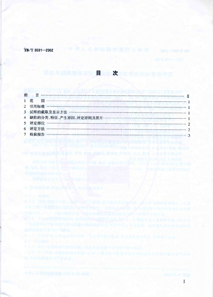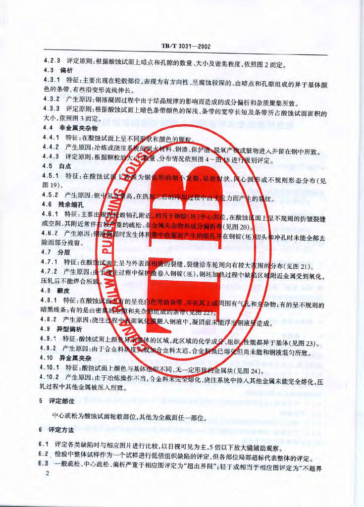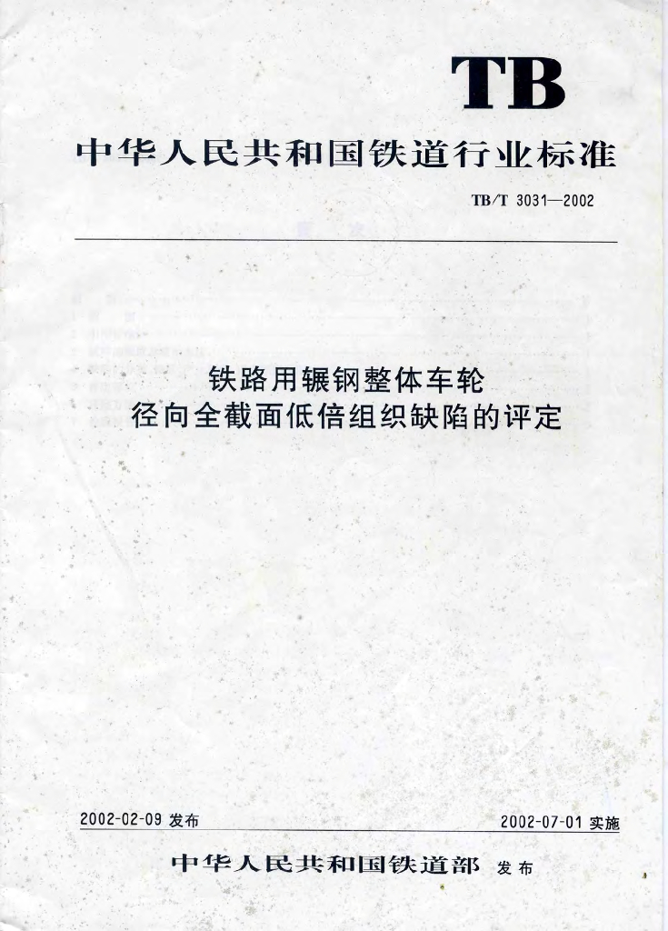 TB/T 3031-2002 铁路用辗钢整体车轮全截面低倍组织缺陷的评定