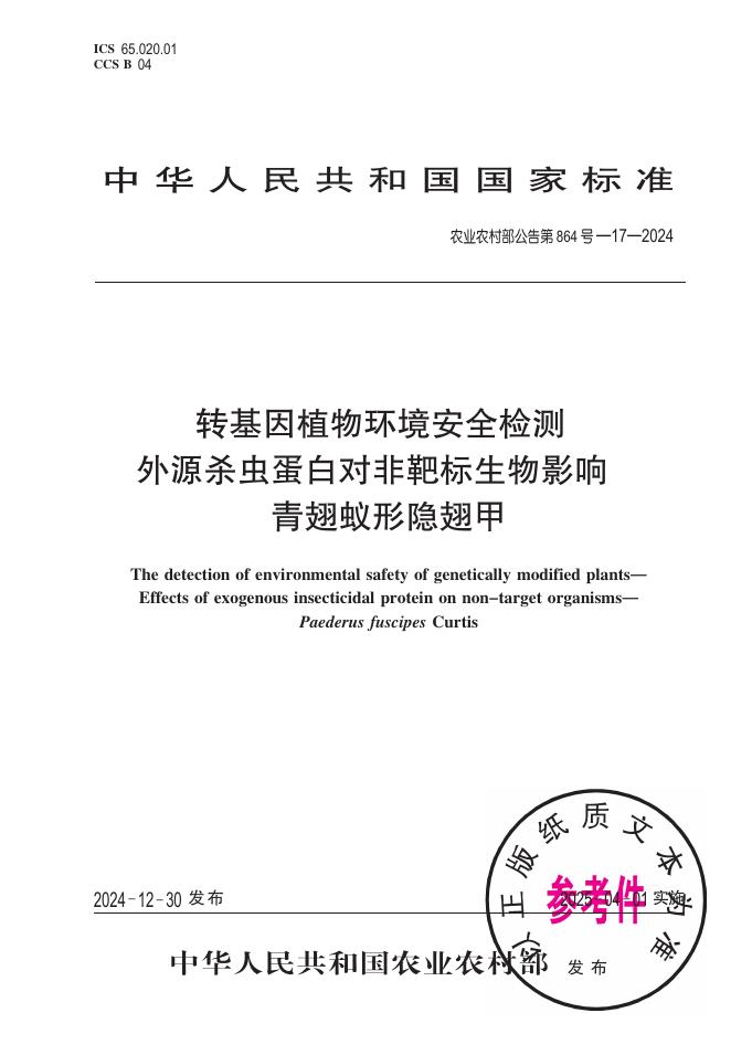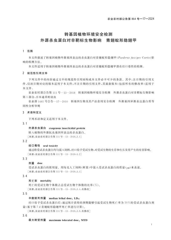 农业农村部公告 第864号-17-2024 转基因植物环境安全检测 外源杀虫蛋白对非靶标生物影响 青翅蚁形隐翅甲