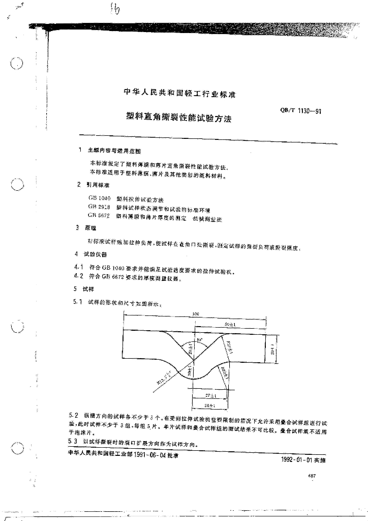 QB/T 1130-1991 塑料直角撕裂性能试验方法