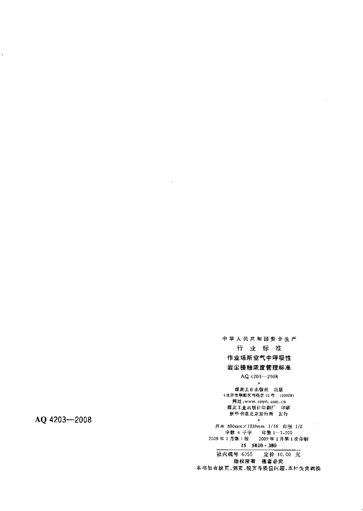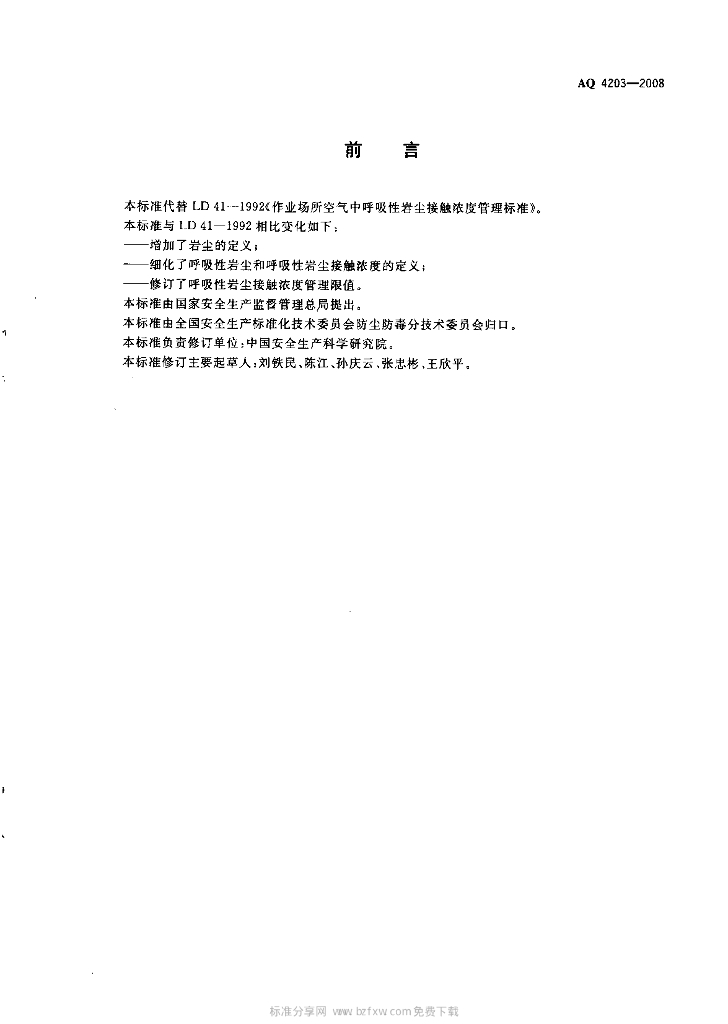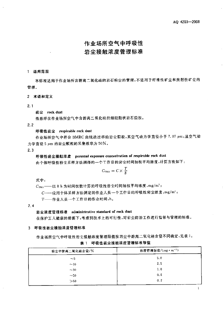 AQ 4203-2008 代替LD41-1992 作业场所空气中呼吸性岩尘接触浓度管理标准