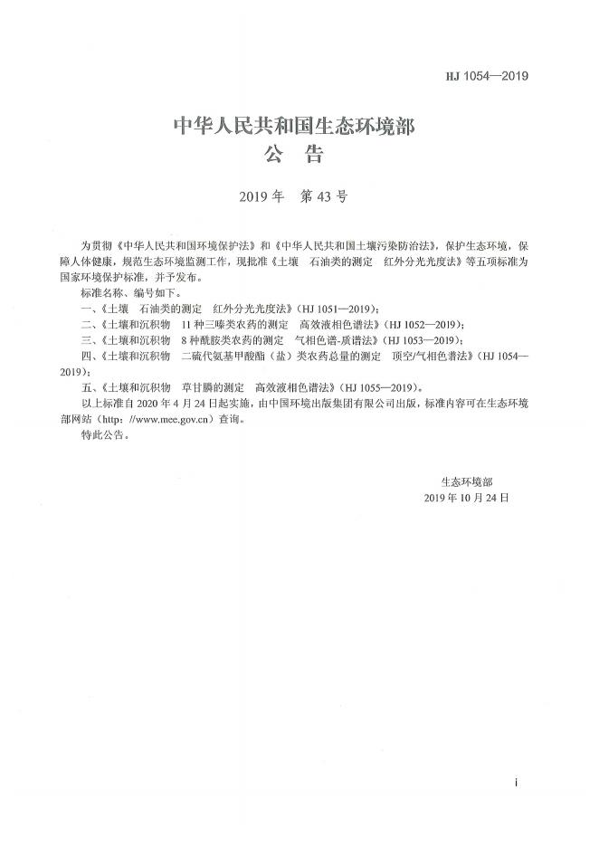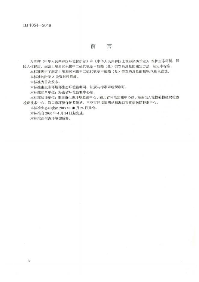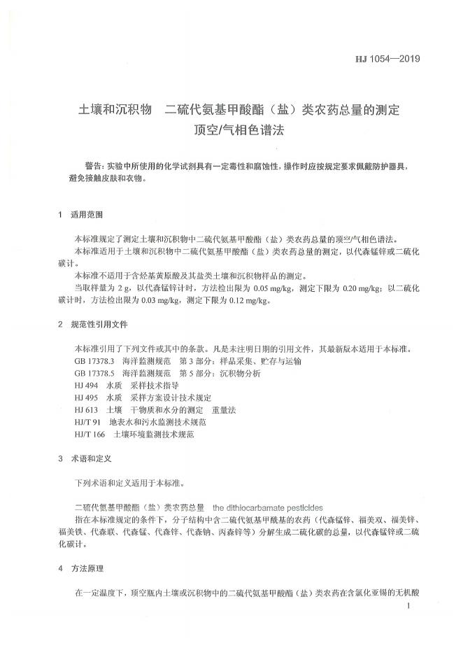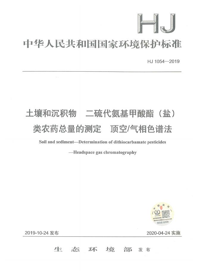 HJ 1054-2019 土壤和沉积物 二硫代氨基甲酸酯(盐)类农药总量的测定 顶空/气相色谱法