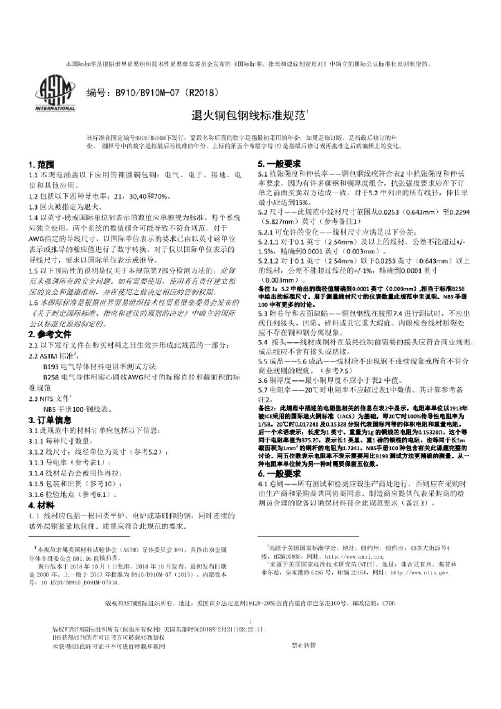 ASTM B910/910M-2007(R2018) 退火铜包钢线标准规范(中文版)